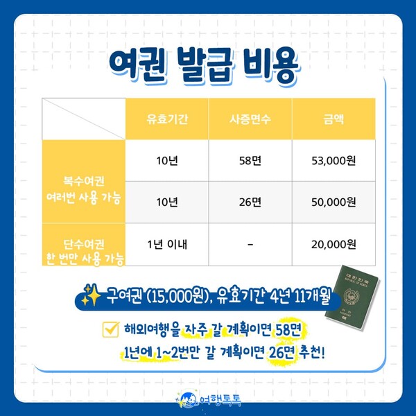 A: 일반적으로 10년 유효기간의 여권은 약 55,000원, 5년 유효기간의 여권은 약 35,000원입니다. 정확한 수수료는 외교부 여권민원실 웹사이트에서 확인할 수 있습니다.