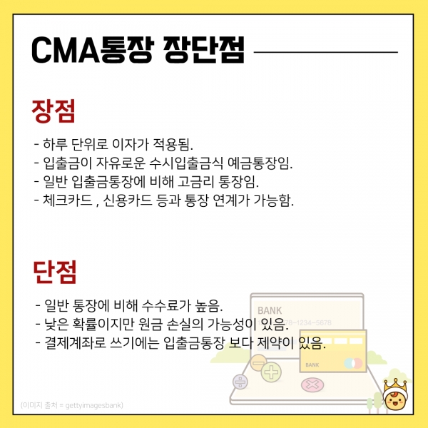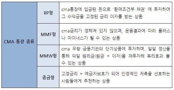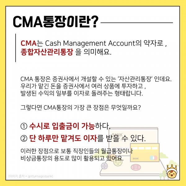 CMA는 무슨 약자일까? Cash Management Account 의 약자로 종합자산관리통장을 의미한다.