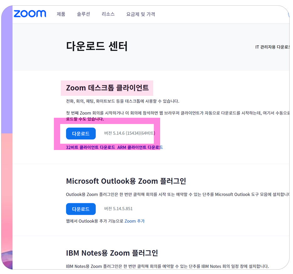 - 웹페이지에서 "Zoom 클라이언트 다운로드" 섹션을 찾습니다.